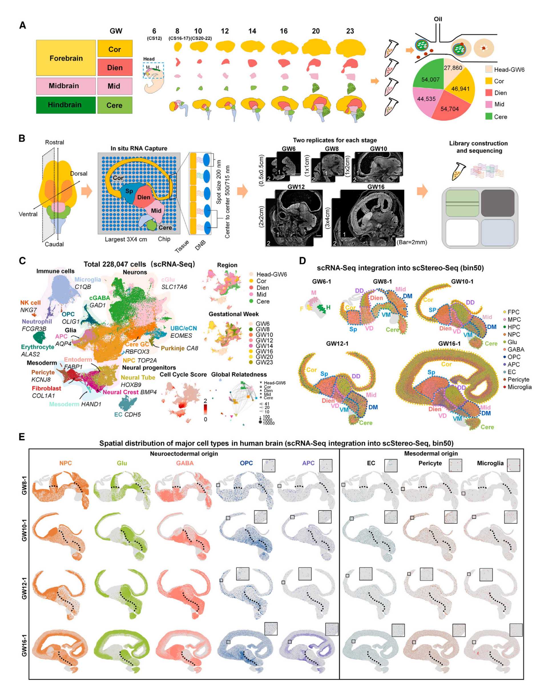 作者利用10x Genomics单细胞测序技术scRNA-seq,作者绘制了来自人类胚胎不同脑区,包括Cor、Dien、Mid、Cere在内,多个发育时间点(GW6、GW8、GW10、GW12、GW14、GW16和GW23)的单细胞转录组图谱(共228,047个细胞)。根据经典的标记基因,鉴定出神经前体细胞、谷氨酸能神经元、GABA能神经元、少突胶质细胞前体细胞、星形胶质细胞前体细胞神经外胚层来源的主要细胞类型,以及中胚层来源的细胞类型(如内皮细胞,周皮细胞和小胶质细胞)等。同时,作者使用华大自主研发的时空组学技术Stereo-seq,对人脑多个发育时间点(GW6、GW8、GW10、GW12和GW16)进行空间转录组测序。通过可视化主要细胞类型的空间分布,本文揭示了发育中人脑不同脑区由不同细胞类型组成的有序分布模式。